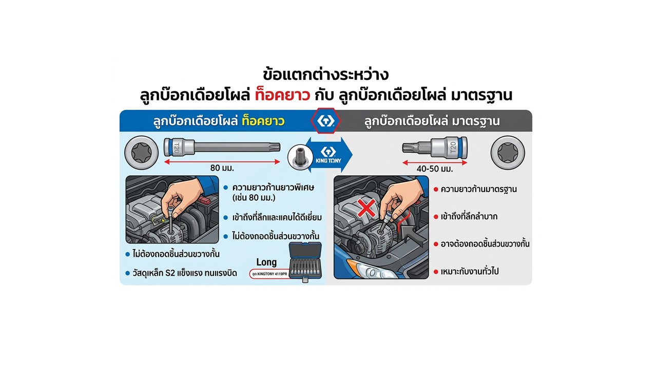 ในงานซ่อมบำรุงระดับอุตสาหกรรมหรือการซ่อมรถยนต์ยุโรป ปัญหาที่พบบ่อยคือสกรูหัวท็อค (Torx) มักจะติดตั้งอยู่ในตำแหน่งที่จมลึกหรือมีชิ้นส่วนอื่นบังหน้างาน การใช้ลูกบ๊อกเดือยโผล่ขนาดมาตรฐานอาจเข้าไม่ถึงหรือไม่สามารถส่งแรงบิดได้เต็มที่ ซึ่งอาจทำให้หัวน็อตเสียรูปได้