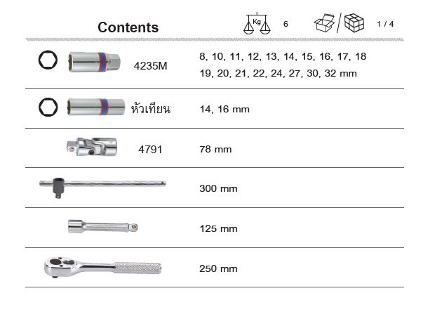 | ประเภทลูกบล็อก | 6 เหลี่ยม แบบยาวพิเศษ (Deep Socket) |