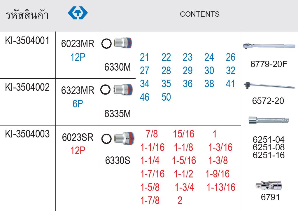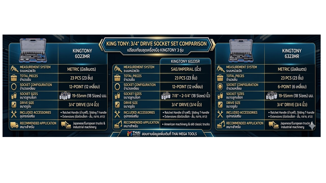 ตรางเทียบรุ่น KINGTONY บ๊อกชุด 3/4” 23 ตัวชุด 6023MR 6023SR 6323MR