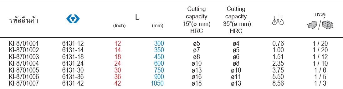 | 6131-42 | 42 นิ้ว | 1050 มม. | Ø18 มม. | Ø13 | 8.56 กก. |