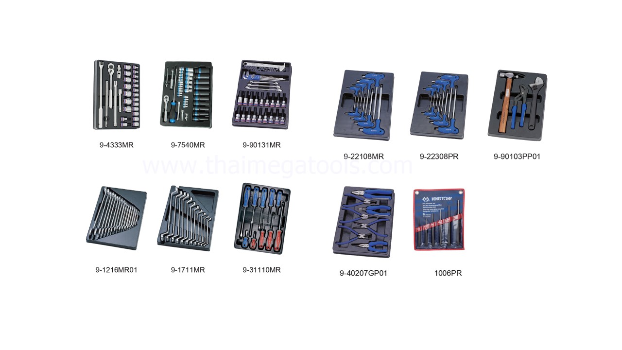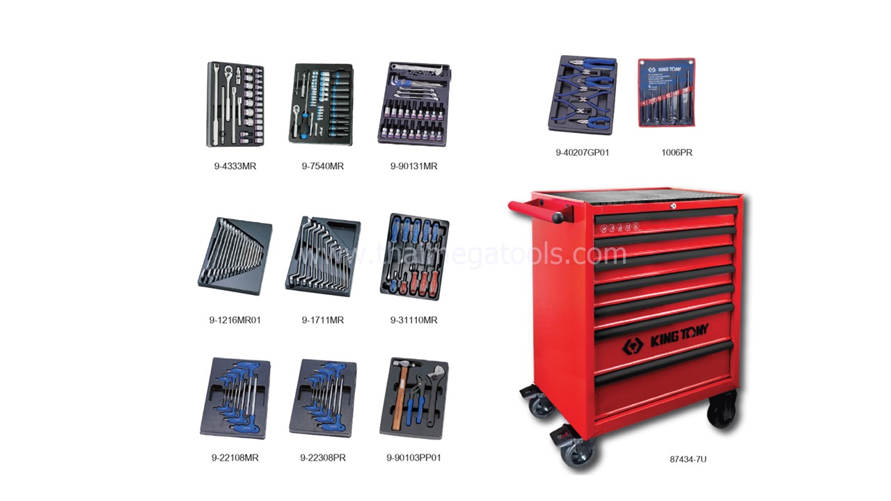 ชุด KINGTONY 934-000MR ประกอบด้วยหมวดหมู่เครื่องมือหลักๆ ที่จัดแยกไว้ในลิ้นชักต่างๆ