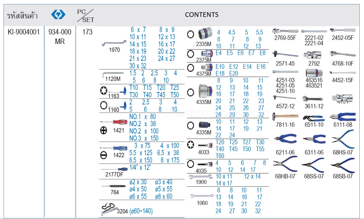 KINGTONY เครื่องมือชุด 173 ชิ้น 934-000MR ประกอบด้วยรายการดังนี้