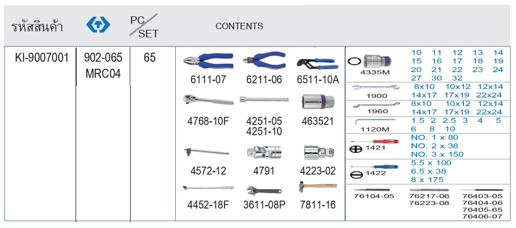 KINGTONY เครื่องมือชุด 65 ชิ้น รุ่น 902-065 MRC04 ประกอบด้วยรายการดังนี้