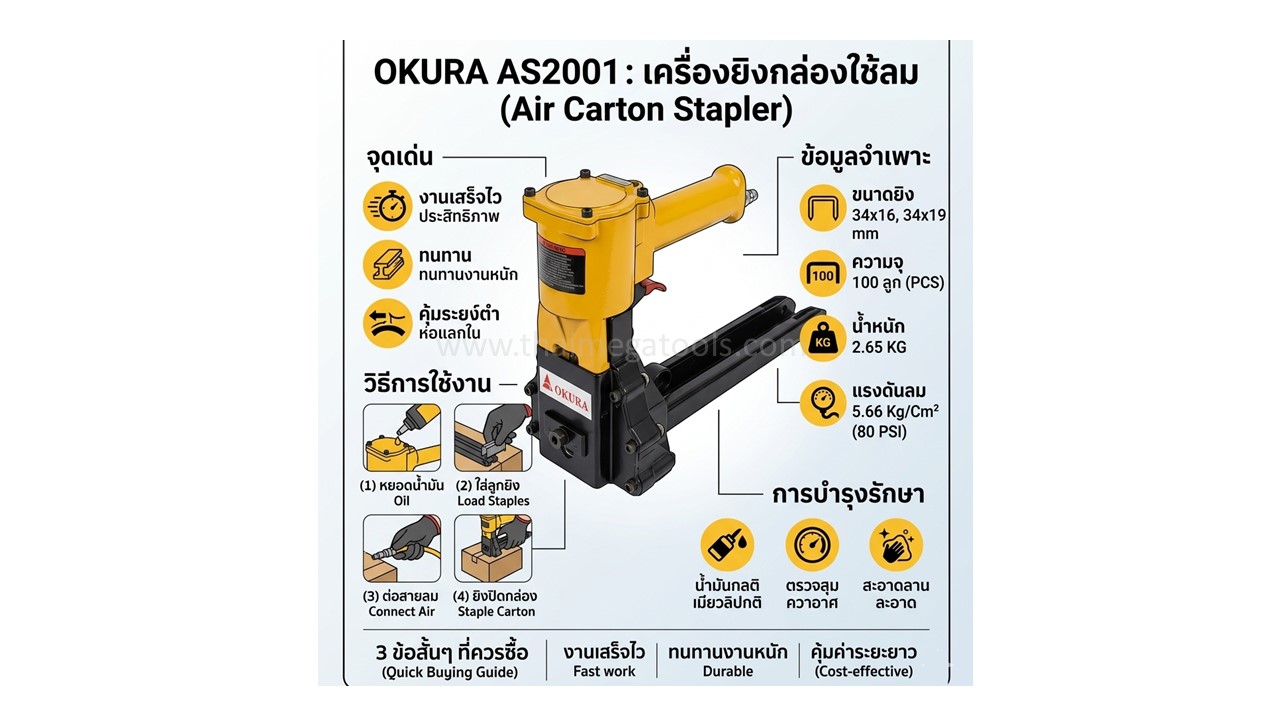 เครื่องยิงกล่องใช้ลม OKURA รุ่น AS2001 เป็นเครื่องยิงตะปูสำหรับประกอบโครงไม้หรือกล่องพาเลทที่มีประสิทธิภาพสูง ออกแบบมาเพื่อการใช้งานหนักในอุตสาหกรรมด้วยกลไกขับเคลื่อนด้วยแรงดันลมที่สม่ำเสมอและทรงพลัง ตัวเครื่องมีความทนทานเป็นเลิศ ผลิตจากวัสดุคุณภาพดีที่ช่วยลดแรงสะท้อนกลับขณะยิง ทำให้ผู้ใช้งานควบคุมเครื่องได้แม่นยำและลดความเหนื่อยล้าสะสม มาพร้อมระบบบรรจุลวดเย็บที่รวดเร็วและรองรับการใช้งานต่อเนื่องได้ยาวนาน เหมาะอย่างยิ่งสำหรับงานแพ็คเกจจิ้ง งานเฟอร์นิเจอร์ และงานยึดไม้เข้ากับวัสดุต่างๆ ที่ต้องการความแน่นหนาและรวดเร็วกว่าการใช้ค้อนหรือเครื่องยิงมือทั่วไป