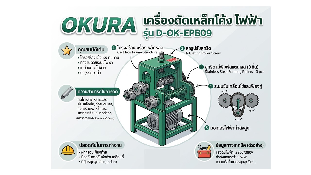 OKURA เครื่องดัดเหล็กโค้งระบบไฟฟ้า รุ่น D-OK-EPB09 เป็นโซลูชันระดับมืออาชีพที่ออกแบบมาเพื่อยกระดับงานดัดท่อให้รวดเร็วและแม่นยำกว่าระบบมือหมุนทั่วไป ขับเคลื่อนด้วยมอเตอร์ไฟฟ้าทรงพลัง 1.5 แรงม้า ผสานการทำงานร่วมกับเกียร์ทดคุณภาพสูง ให้แรงบิดที่สม่ำเสมอและนิ่งสนิท ช่วยทุ่นแรงผู้ใช้งานได้ 100% เหมาะสำหรับการผลิตชิ้นงานจำนวนมากอย่างต่อเนื่อง ตัวเครื่องรองรับการดัดทั้งท่อกลมและเหล็กสี่เหลี่ยมหลายขนาด (16-25 มม.) พร้อมโครงสร้างเหล็กหล่อที่แข็งแรงทนทาน มาพร้อมขาตั้งในตัวที่มั่นคง ช่วยให้งานดัดซุ้มโค้ง เฟอร์นิเจอร์ หรือโครงสร้างเหล็กต่างๆ มีรัศมีที่สวยงามและได้มาตรฐานสากลในทุกชิ้นงาน