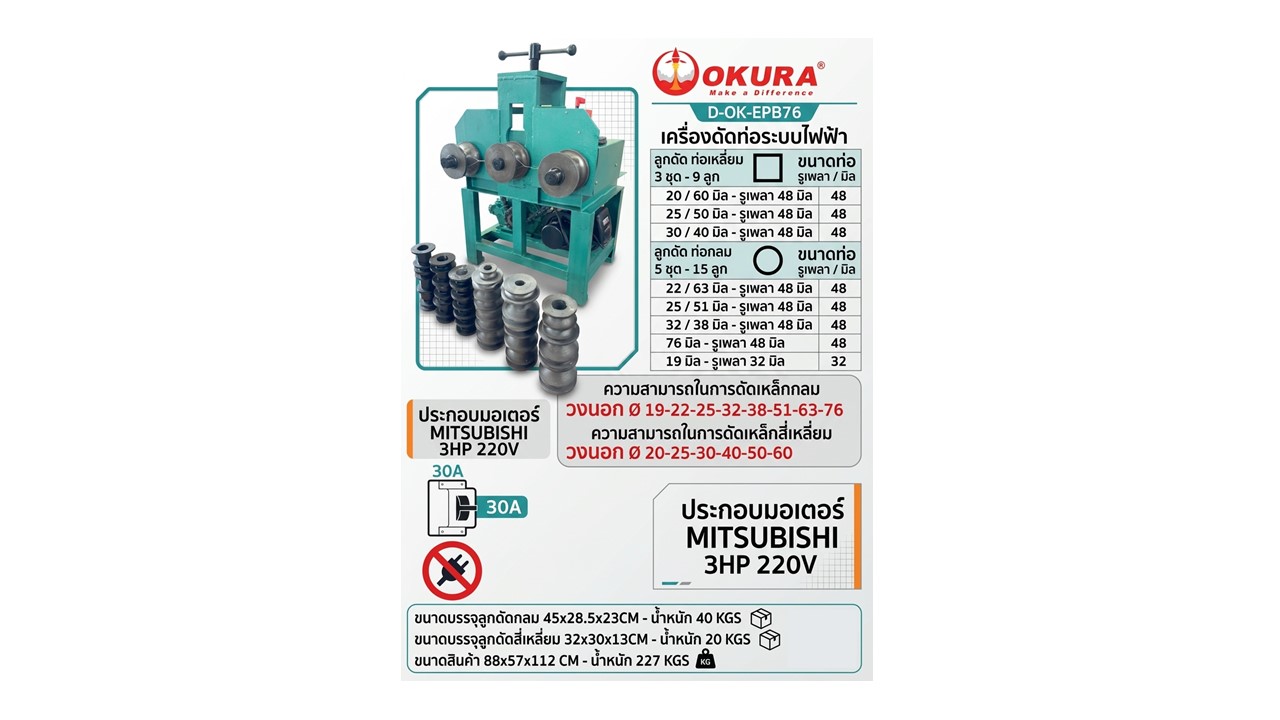 เครื่องดัดเหล็กโค้ง OKURA รุ่น D-OK-EPB76 เป็นเครื่องมืออุตสาหกรรมที่ออกแบบมาเพื่อตอบโจทย์งานดัดท่อเหล็ก ท่อสแตนเลส และอลูมิเนียมให้มีความโค้งมนที่สม่ำเสมอ ด้วยระบบขับเคลื่อนแบบไฟฟ้าที่ให้กำลังแรงบิดสูง ช่วยให้งานดัดที่เคยยากกลายเป็นเรื่องง่าย ลดการสูญเสียชิ้นงานจากการบุบหรือบิดเบี้ยว