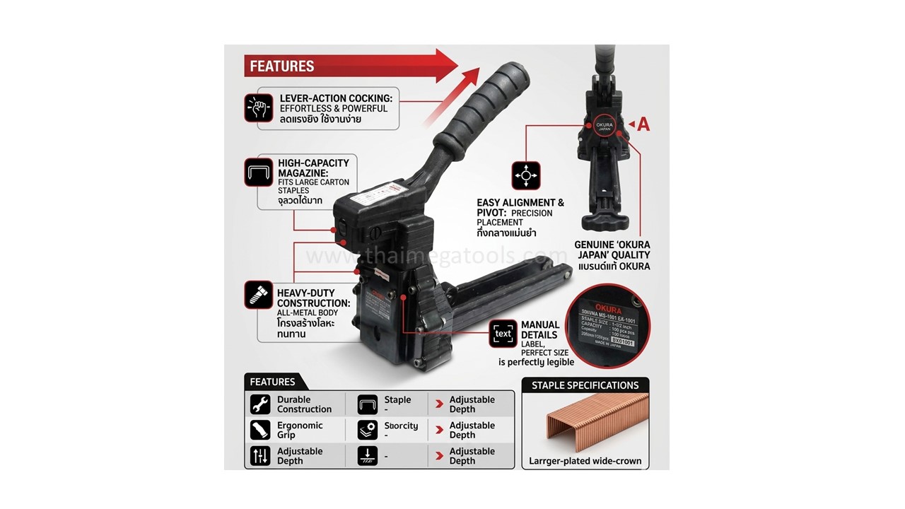 OKURA เครื่องยิงกล่องใช้มือ เป็นเครื่องมือที่ออกแบบมาเพื่อเพิ่มความสะดวกรวดเร็วในการปิดกล่องกระดาษลูกฟูก โดยทำงานด้วยระบบกลไกคันโยกที่ให้แรงกดสูง ช่วยให้ลวดเย็บฝังแน่นเข้ากับเนื้อกระดาษได้อย่างแม่นยำและแข็งแรงกว่าการใช้เทปกาวทั่วไป ตัวเครื่องผลิตจากวัสดุโลหะคุณภาพดีที่มีความทนทานต่อการใช้งานหนัก ด้ามจับถูกออกแบบมาให้กระชับมือเพื่อลดความเมื่อยล้าขณะใช้งานต่อเนื่อง เหมาะอย่างยิ่งสำหรับงานบรรจุภัณฑ์ในคลังสินค้าและธุรกิจขนส่งที่ต้องการความสวยงามและความปลอดภัยในการจัดส่งสินค้าที่รับน้ำหนักได้ดีเยี่ยม