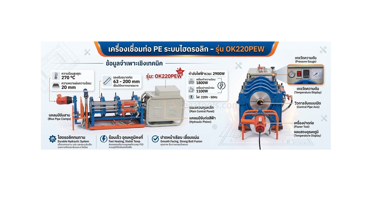 OKURA เครื่องเชื่อมท่อ เป็นเครื่องเชื่อมท่อแบบชน (Butt Fusion) ระบบไฮดรอลิกประสิทธิภาพสูงที่ออกแบบมาเพื่อรองรับงานหนักและงานวางระบบท่ออุตสาหกรรมขนาดใหญ่ตั้งแต่ 63-200 มม. โดยเฉพาะ ตัวเครื่องโดดเด่นด้วยโครงสร้างอลูมิเนียมหล่อที่แข็งแรงทนทานพร้อมกระบอกไฮดรอลิกคู่ที่ให้แรงกดแม่นยำสม่ำเสมอ ทำงานร่วมกับแผ่นทำความร้อนระบบดิจิทัลที่ควบคุมอุณหภูมิได้นิ่งและรอยเชื่อมเนียนเรียบไม่เกิดฟองอากาศ อีกทั้งยังมีเครื่องปาดหน้าท่อกำลังไฟ 1100W มาในชุดเพื่อเตรียมผิวสัมผัสให้สมบูรณ์ที่สุด ช่วยให้ผู้รับเหมาและช่างมืออาชีพมั่นใจในความแข็งแรงทนทานของรอยเชื่อมตามมาตรฐานวิศวกรรมในทุกไซต์งาน
