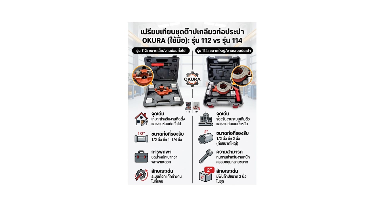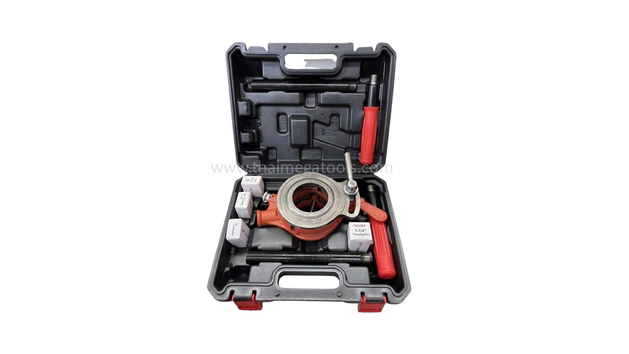 OKURA ชุดต๊าปเกลียวประปารุ่น 112 และ 114 เป็นชุดเครื่องมือทำเกลียวแบบใช้มือระบบก๊อกแก๊ก (Ratchet) ที่ออกแบบมาเพื่อความคล่องตัวในการทำงานในพื้นที่จำกัดโดยไม่ต้องหมุนด้ามจับครบรอบ ช่วยผ่อนแรงได้ดีด้วยด้ามจับที่ยาวและฟันต๊าปเหล็กกล้าคุณภาพสูงที่ให้เกลียวมาตรฐาน BSPT สำหรับงานท่อประปาและท่อเหล็กทั่วไป โดยรุ่น 112 จะเน้นความกะทัดรัดครอบคลุมท่อขนาดเล็กถึงกลาง (สูงสุด 1-1/4 นิ้ว) ในขณะที่รุ่น 114 จะรองรับการใช้งานที่หลากหลายกว่าจนถึงขนาดท่อเมนใหญ่ (สูงสุด 2 นิ้ว) ทำให้เหมาะทั้งสำหรับงานซ่อมแซมเร่งด่วนและงานติดตั้งระบบน้ำมืออาชีพที่ไม่ต้องพึ่งพาไฟฟ้า